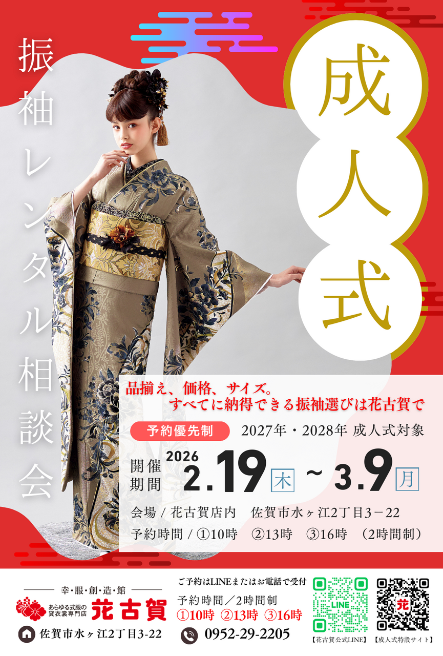 花古賀では、品質・価格・サイズ、すべてにご納得いただける振袖を豊富にご用意し、